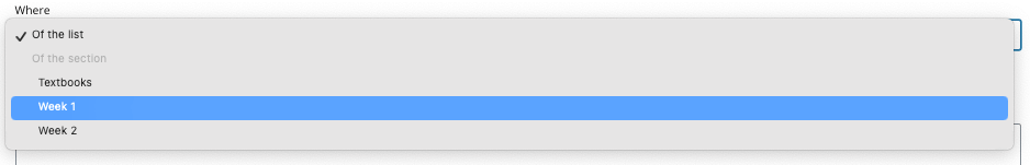 Of the section - adds the resource to a specific section (the sections of the list are then listed in this menu)
