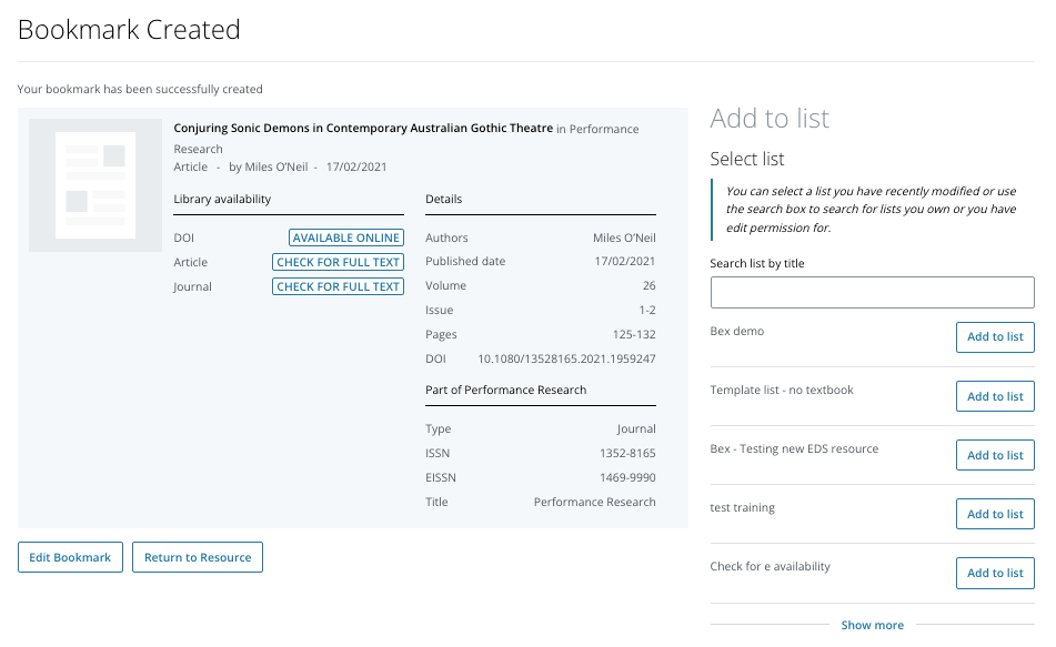 The new bookmarking interface will open and show a preview of how the resource will appear on your Reading List. This example is of an article bookmarked from Library Search:
