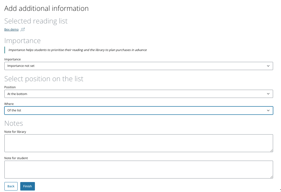 The importance - select from the available importances to indicate your expectations of the student (eg. Prescribed Reading, Recommended Reading, etc.)