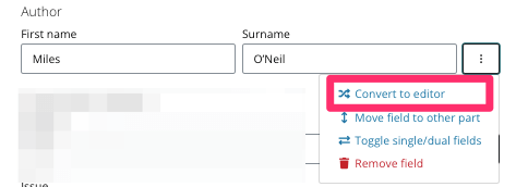If an editor has been added into the author field incorrectly, click the three dots next to the field and select Convert to editor.