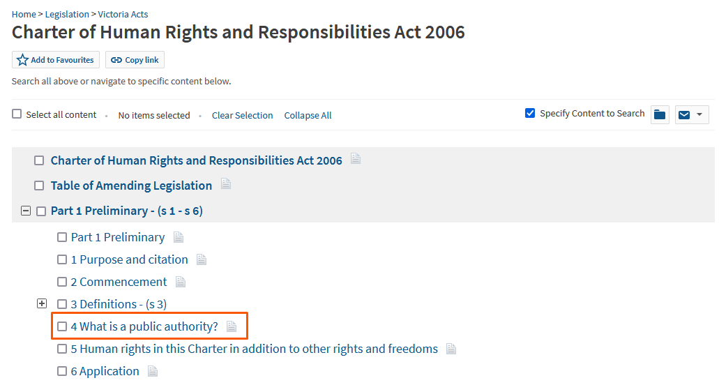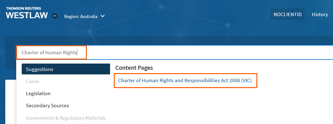 The quickest way to access the legislation service is to start typing in the name of the Act in the main search bar on the Westlaw Australia homepage. This example below shows how to search for the Charter of Human Rights and Responsibilities Act 2006 (Vic), section 4.