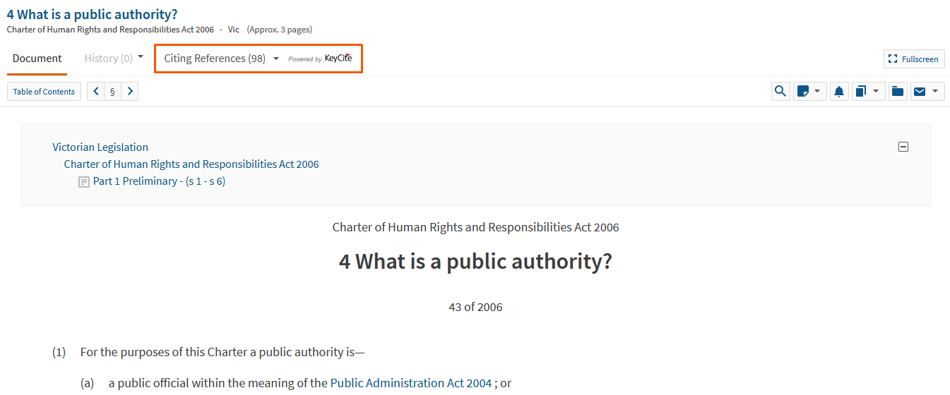 Each piece of legislation includes citation information generated by Westlaw’s KeyCite service. This service tracks any cases, legislation or secondary sources which have cited the relevant Act.