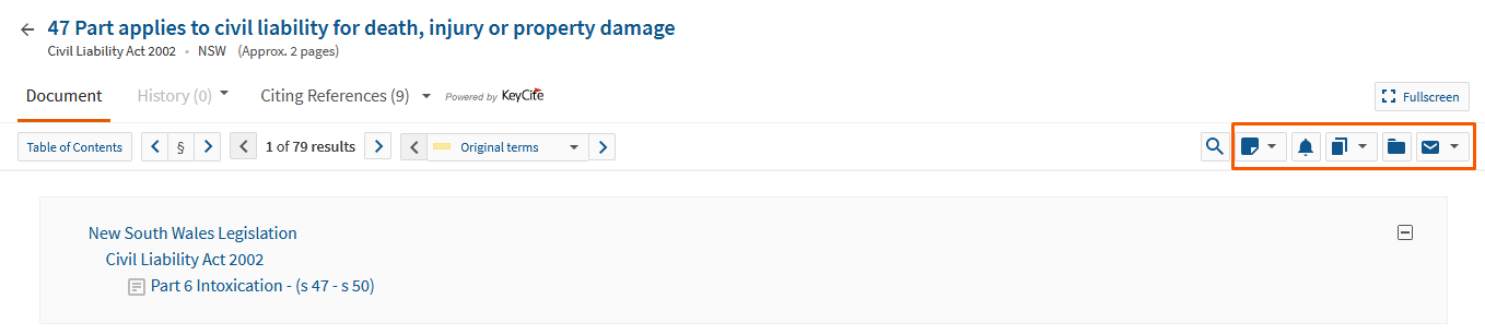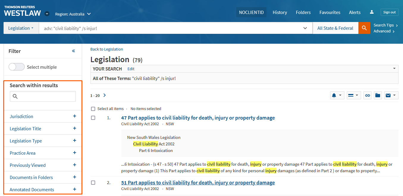 If you do not know the name of the relevant legislation, you can search for Acts on specific Practice Areas or by typing in keywords. This example uses keywords of looking for the phrase “civil liability” within the same sentence of injury (or injuries): “civil liability” /s injur!